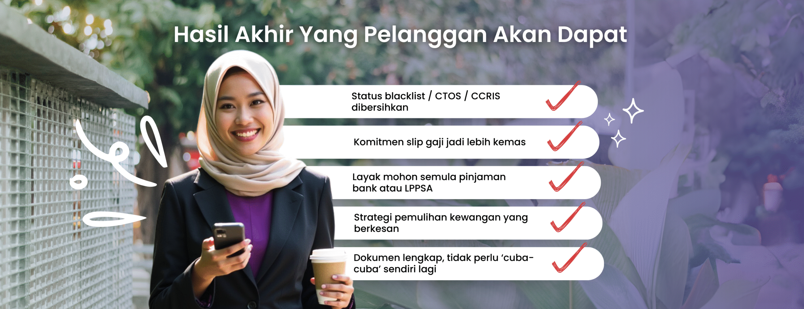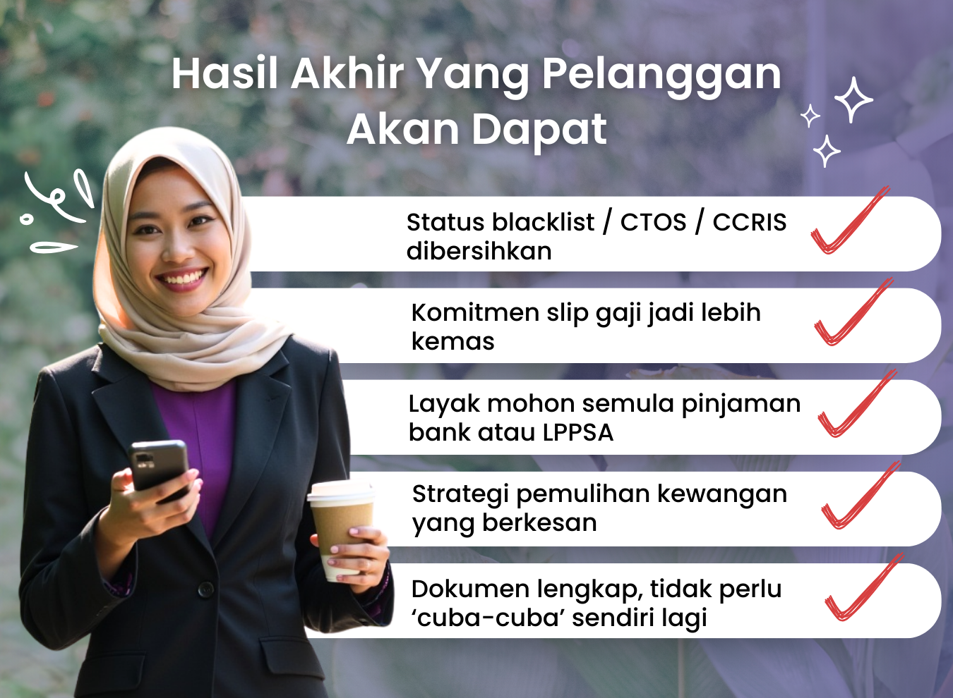 Kami bukan terus mohon loan. Kami mula dengan audit penuh slip gaji + laporan CTOS/CCRIS. Lepas tu baru kami susun strategi berdasarkan: